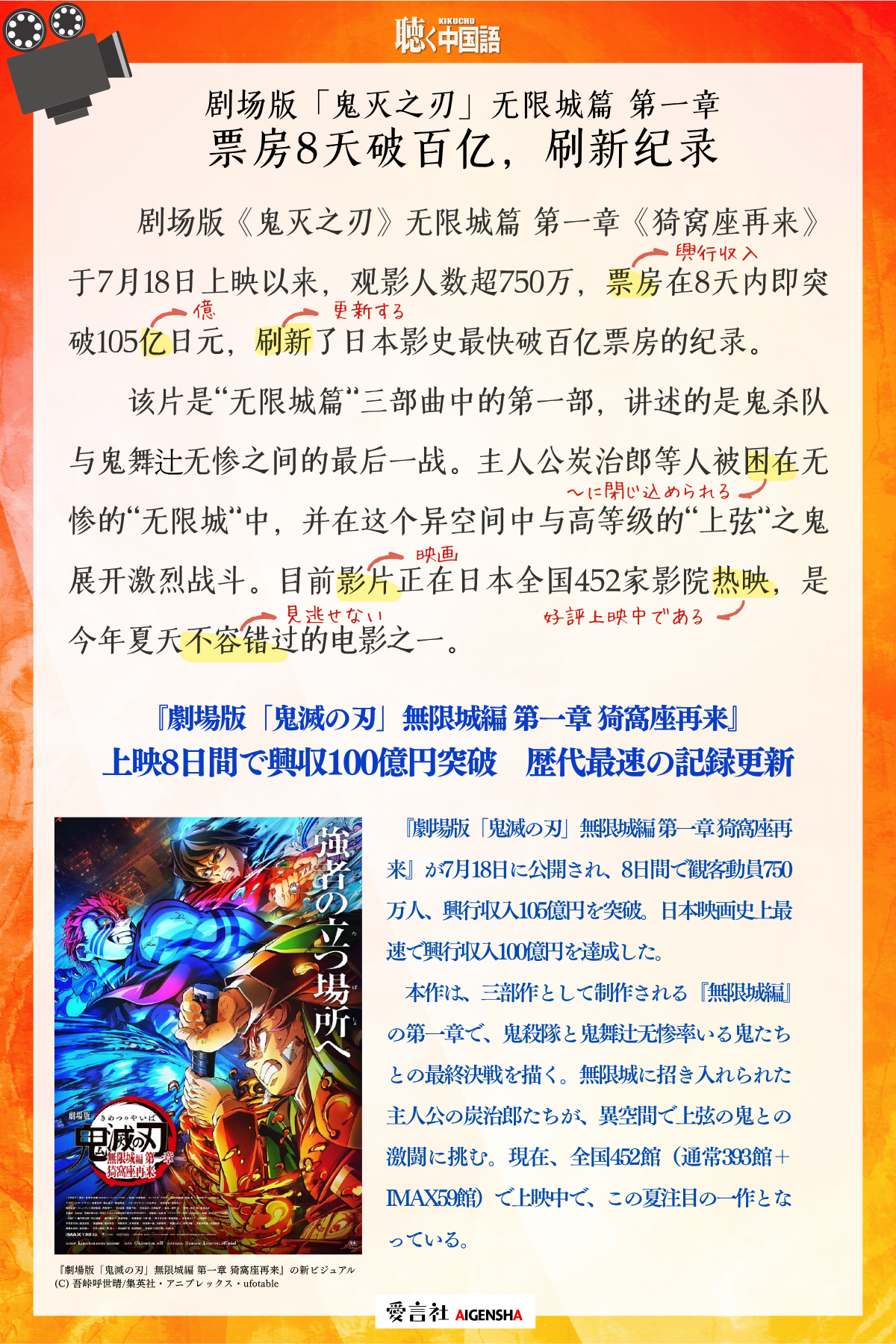 『劇場版「鬼滅の刃」無限城編 第一章 猗窩座再来』上映8日間で興収100億円突破、歴代最速の記録更新