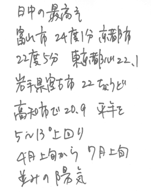 「日中の最高気温は富山市で24度1分、京都市で22度5分、東京の都心で22度1分、岩手県宮古市で22度ちょうど、高知市で20度9分などと、平年を5度から13度ほど上回り、4月中旬から7月上旬並みの陽気となりました。」