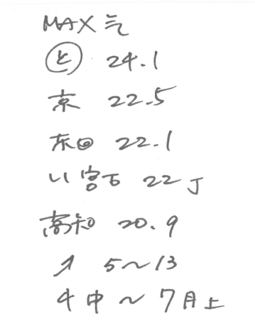例えば、「日中の最高気温は」と言われたら、「最高」では字数が多いので「MAX」と書いています。この音声では地名が続きます。ここは間違えられないので、自分が確実にわかる方法でメモを取ります。富山市の「富」は画数が多いのでひらがなの「と」で代用。名詞なので、名詞を表す○で囲みます。「东」の後ろに◎のような記号が書いてありますが、これは「東京の都心」と言っていたので、中心を表す二重丸を書いたものです。「22」は「22度ちょうど」の「ちょうど」を「Just」の「J」で表しています。「上回り」は上向きの矢印を書けば、字を書かなくても先ほど聴いた内容を思い出すことができます。「名詞を表す○」とか「ちょうどを表すJ」などは、いずれも独自の決め事です。記号やメモ取りの方法も自分なりのやり方を決めておくと便利です。