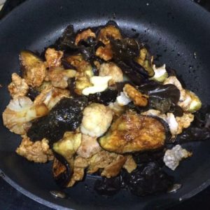 ③熱したフライパンに大さじ1の油を入れ、すぐに豚肉を加えて軽く炒め(煸炒)、半分火が通ったら取り出す。同じフライパンでナスを両面焼き(煎)、水分を飛ばす。