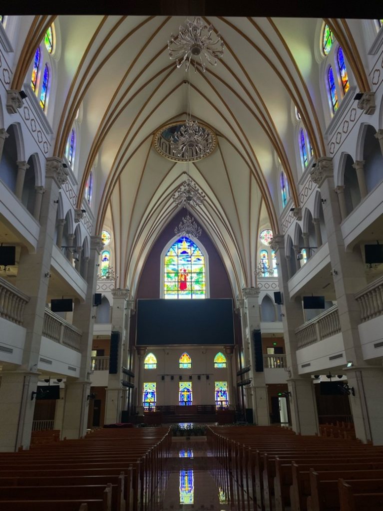 その後訪れた扬子江国际礼拜堂はキリスト教の礼拝堂で、外観も内装も美しく、静寂の中に身を置くと不思議と心が落ち着く場所だった。ステンドグラスがとても美しい立派な礼拝堂だ。