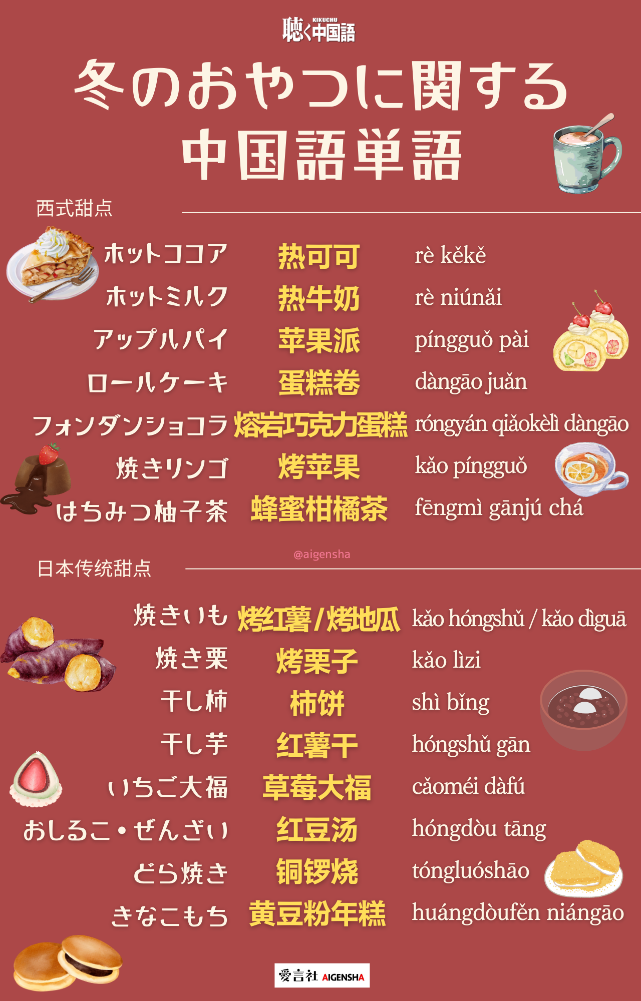そこで今回は、冬にぴったりの“ほっこりおやつ”を洋風・和風から集めました。おやつで温まりつつ、中国語単語も楽しく覚えていきましょう!