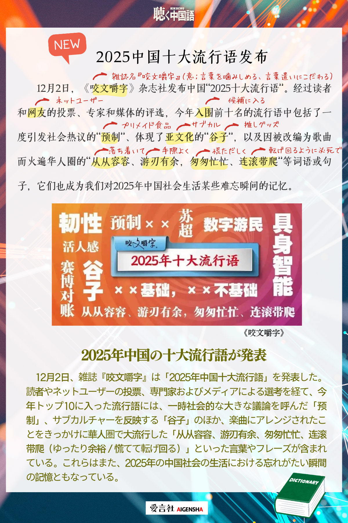 2025年中国の十大流行語が発表中国語ニュース 2025.12.04使える中国語ニュースフレーズは、毎週土曜のメルマガにて配信中!月刊『聴く中国語』のチラ見せや最新情報のほか、中国語単語帳や中国語一分クイズなど面白いコラムも!ぜひ登録してみてくださいね。メルマガの登録はこちら