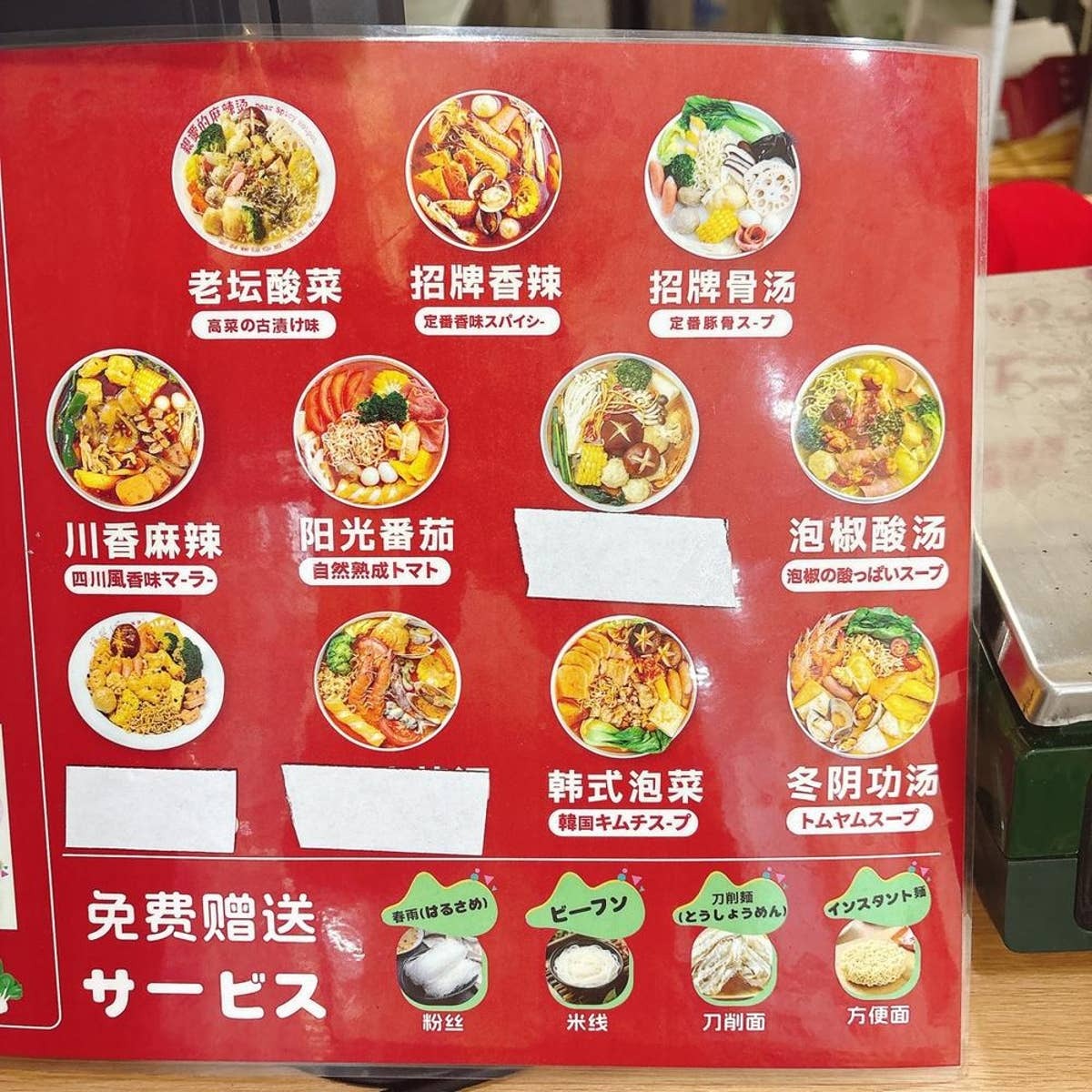 特徴:牛骨スープがベースの白っぽいクリーミーでまろやかなスープ。具材は最大92種。量り売りトッピングの値段(100g=400円)のみ。1,000円以上で好きな麺を80gサービス。スープは麻辣から辛さゼロの白湯まで選べ、辛さは四段階から選択。