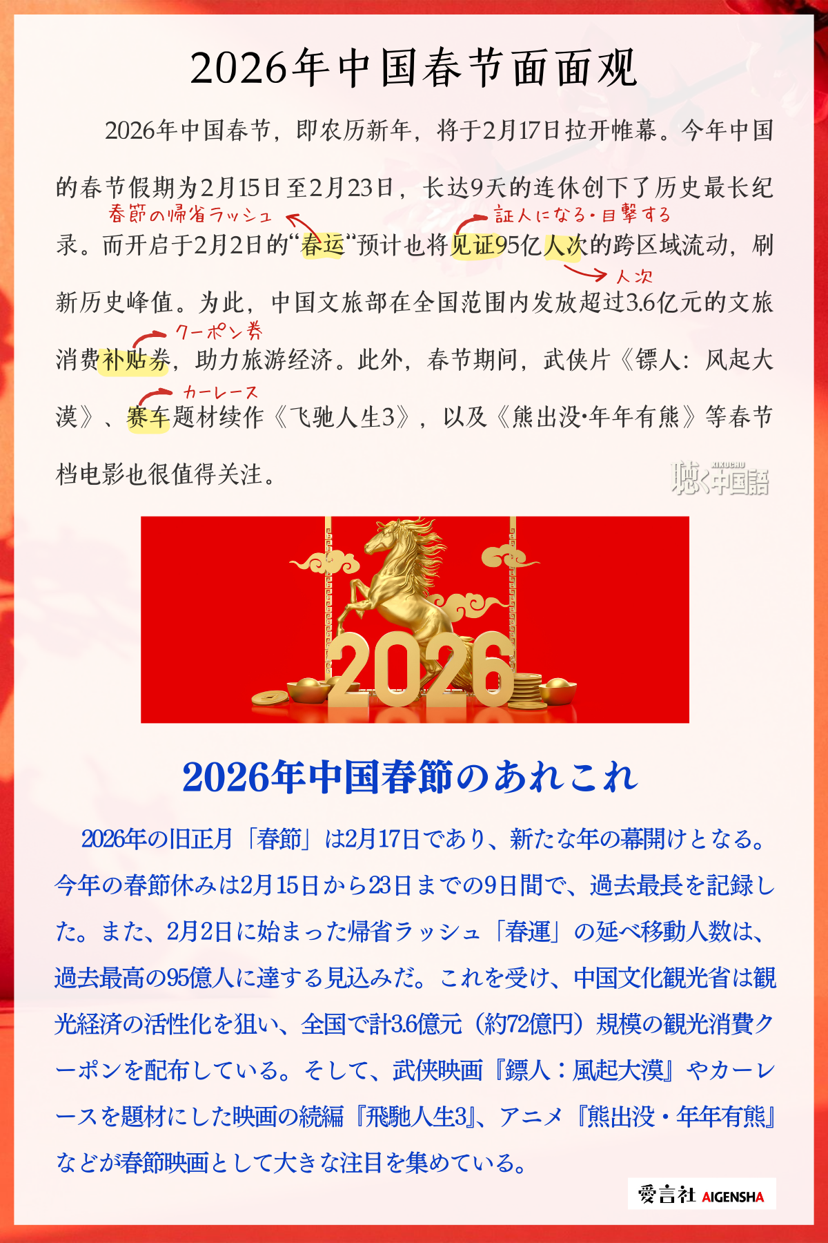 2026年中国春节,即农历新年,将于2月17日拉开帷幕。今年中国的春节假期为2月15日至2月23日,长达9天的连休创下了历史最长纪录。而开启于2月2日的“春运”预计也将见证95亿人次的跨区域流动,刷新历史峰值。为此,中国文旅部在全国范围内发放超过3.6亿元的文旅消费补贴券,助力旅游经济。此外,春节期间,武侠片《镖人:风起大漠》、赛车题材续作《飞驰人生3》,以及《熊出没·年年有熊》等春节档电影也很值得关注。