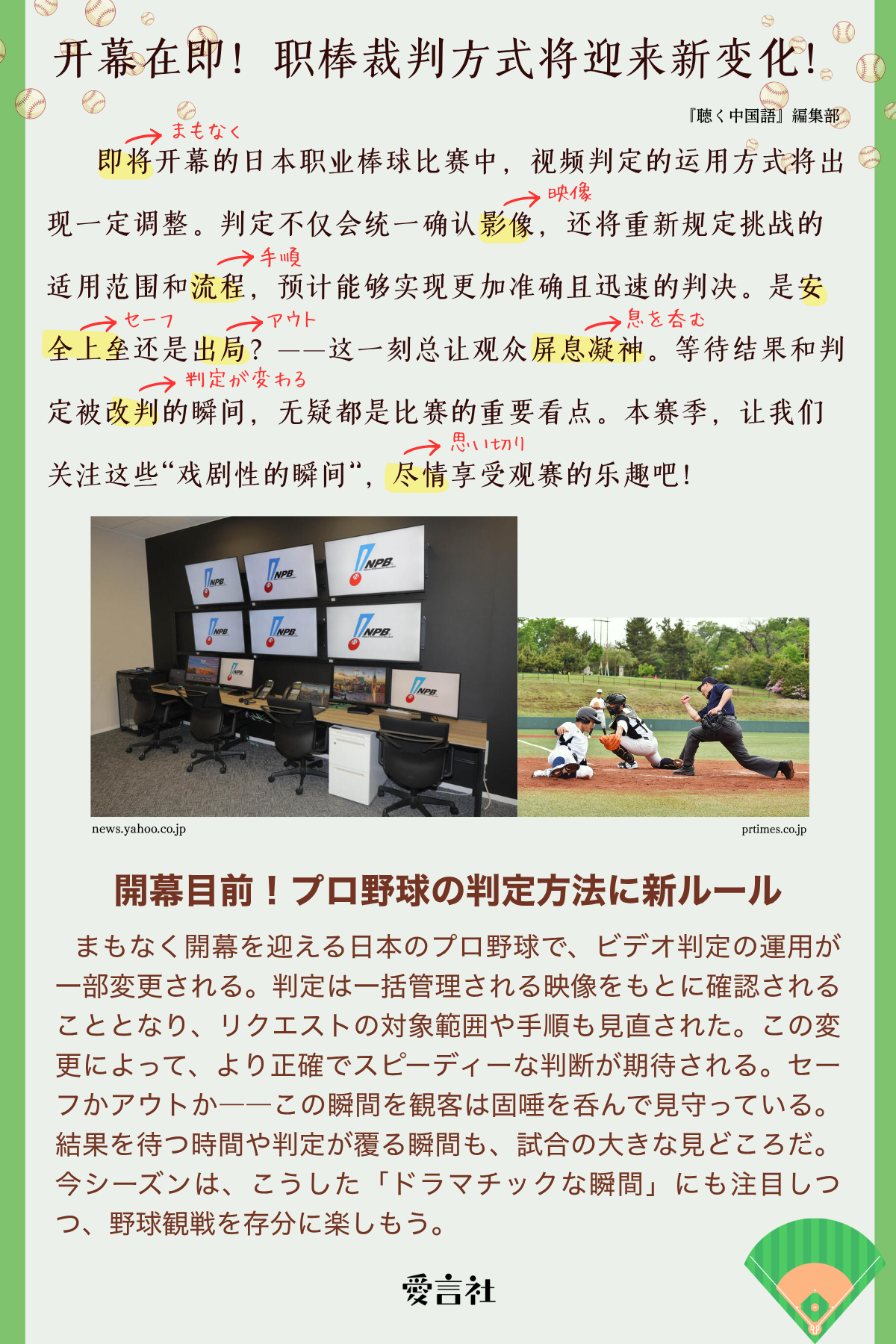即将开幕的日本职业棒球比赛中,视频判定的运用方式将出现一定调整。判定不仅会统一确认影像,还将重新规定挑战的适用范围和流程,预计能够实现更加准确且迅速的判决。是安全上垒还是出局?——这一刻总让观众屏息凝神。等待结果和判定被改判的瞬间,无疑都是比赛的重要看点。本赛季,让我们关注这些“戏剧性的瞬间”,尽情享受观赛的乐趣吧!