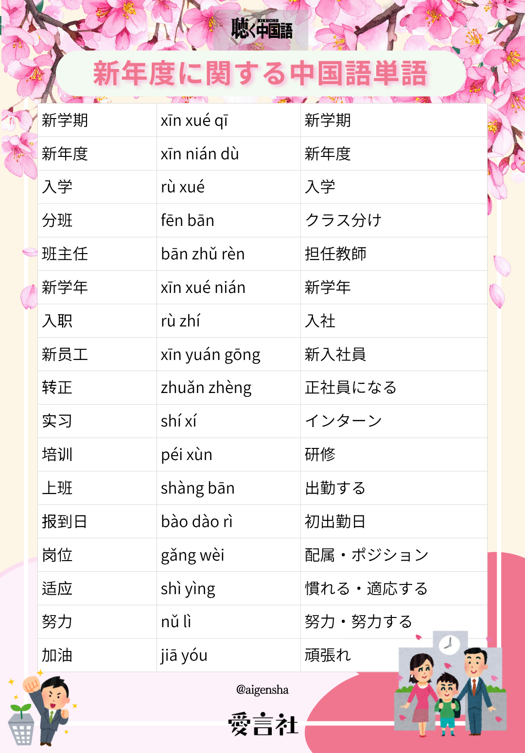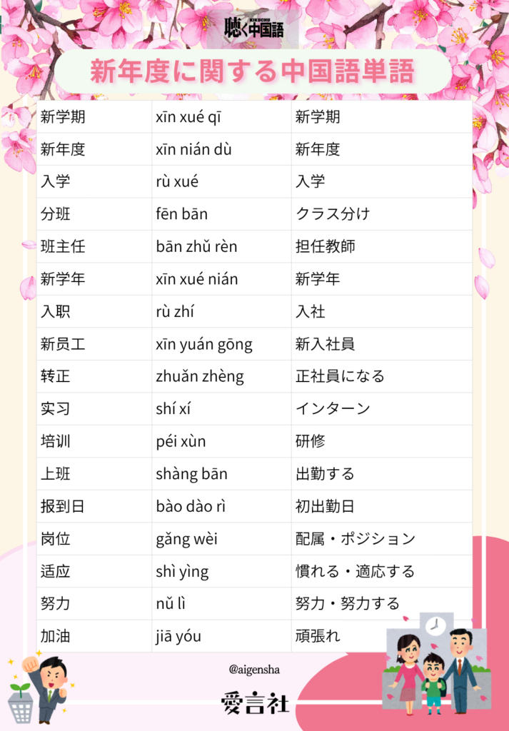 新しいスタートのこの時期に、中国語の表現も一緒に少しずつ増やしていきましょう。