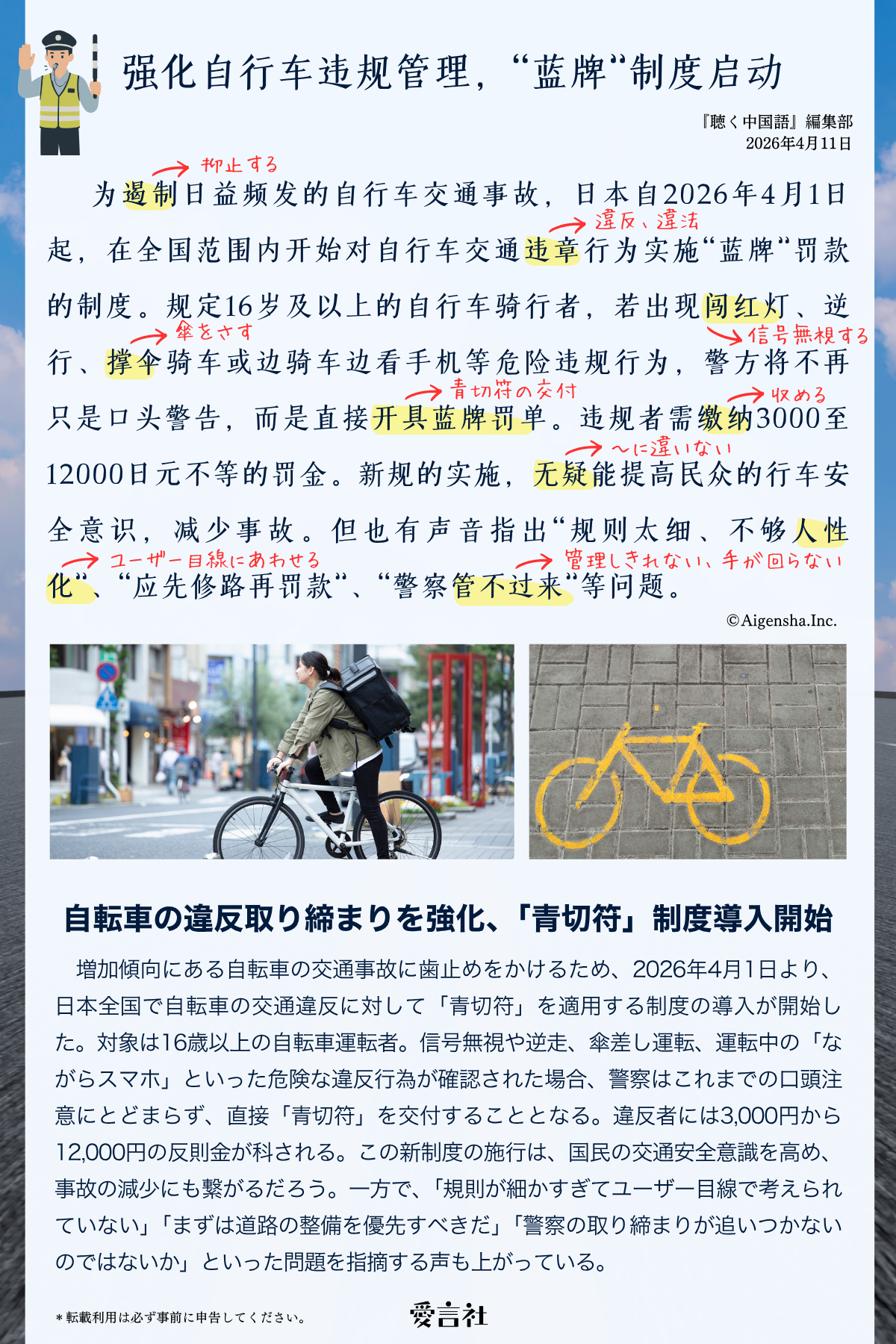 为遏制日益频发的自行车交通事故,日本自2026年4月1日起,在全国范围内开始对自行车交通违章行为实施“蓝牌”罚款的制度。规定16岁及以上的自行车骑行者,若出现闯红灯、逆行、撑伞骑车或边骑车边看手机等危险违规行为,警方将不再只是口头警告,而是直接开具蓝牌罚单。违规者需缴纳3000至12000日元不等的罚金。新规的实施,无疑能提高民众的行车安全意识,减少事故。但也有声音指出“规则太细、不够“人性化”、“应先修路再罚款”、“警察管不过来”等问题。