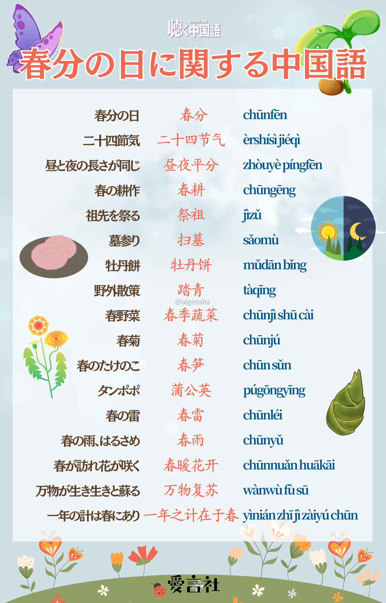 春分の日に関する中国語を集めました。野外散策しながらぜひ覚えてみてくださいね。
