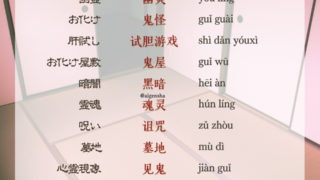 中国語の常用表現夏の怪談、怖い話に関する中国語単語 夏の風物詩といえばやっぱり怪談。 背筋がひんやりするような言葉を集めました。 ぜひ涼しさを感じながら中国語を楽しんでください! 怪談 怪谈/鬼故事 guài tán / guǐ gù... 2025.08.21中国語の常用表現話題別単語リスト