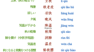 中国語の常用表現立秋に関する中国語単語 まだまだ秋なんて程遠いような気もしますが、8月7日は立秋。 なんと暦の上では秋が始まりました…! 秋の気配を感じつつ、栄養と休息をしっかりとって、季節の変わり目を元気に過ごしましょう! ... 2025.08.13中国語の常用表現話題別単語リスト