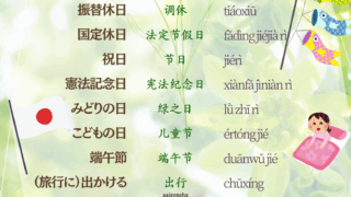 まもなくゴールデンウィーク(黄金周=huángjīn zhōu)を迎えます。 みなさんはどこかにお出かけする予定はありますか? 中国では同じ時期に労働節(劳动节/五一节=láodòng jié / wǔyī jié)があり、よ...